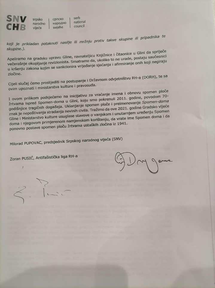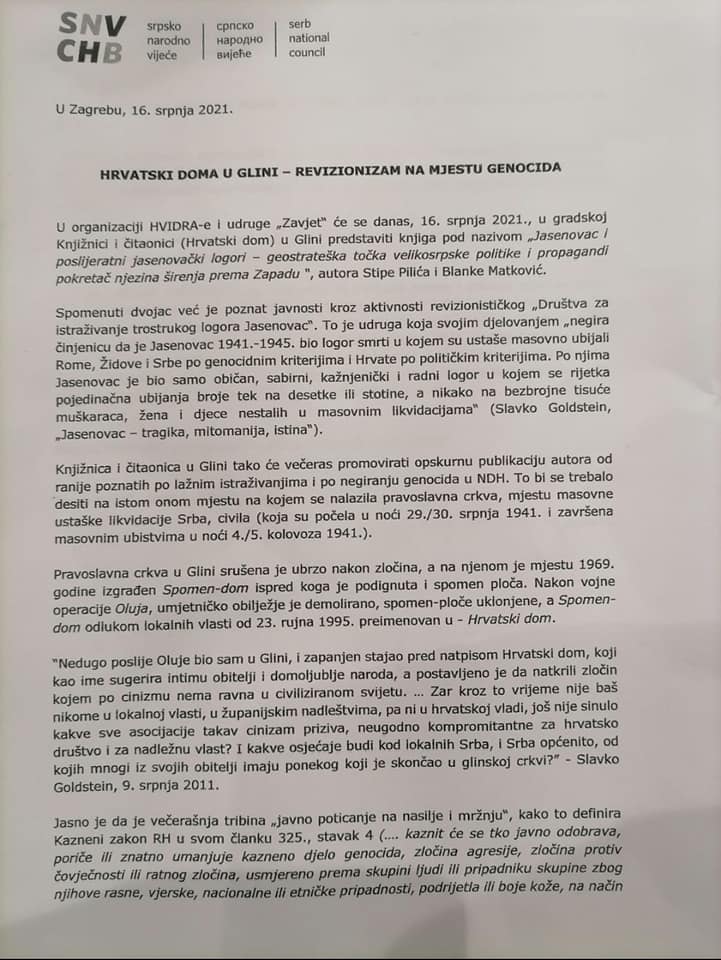 Dana 16. srpnja 2021. Srpsko narodno vijeće (SNV) i Antifašistička liga RH objavile su priopćenje s pokušajem diskreditiranja članova naše udruge i spriječavanja predstavljanja knjige „Jasenovac i poslijeratni jasenovački logori, Geostrateška točka velikosrpske politike i propagandni pokretač njezina širenja prema zapadu“ koje se večeras, 16. srpnja, odražava u Hrvatskom domu u hrvatskom gradu Glini. Priopćenje koje potpisuju Milorad Pupovac i Zoran Pusić kao lideri spomenutih organizacija vrvi netočnostima, pa čak i klevetama.